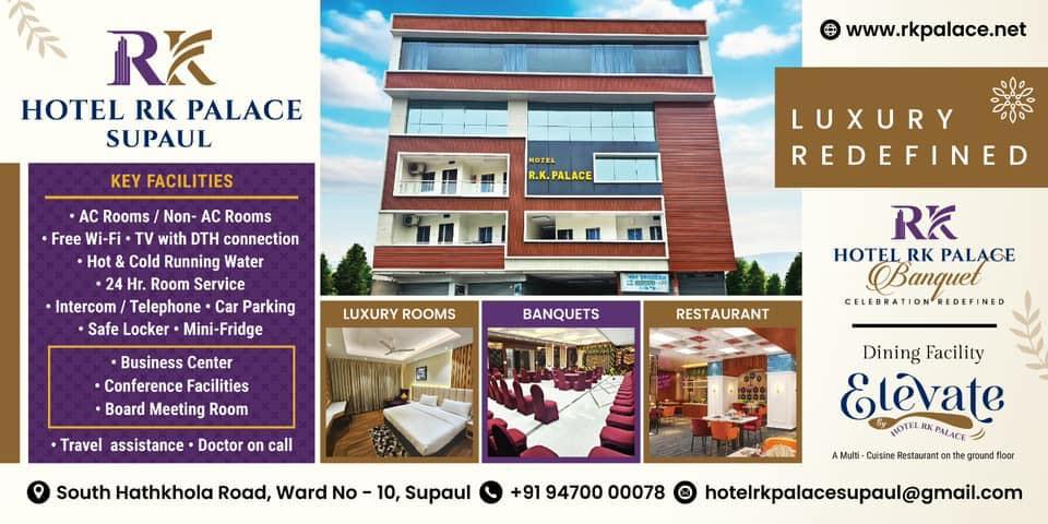 Hotel R.K. Palace is a luxury hotel that is situated in the South Hatkhola Road, Near Railway Station, Supaul, Bihar. Famous for warm hospitality and superior facilities, this hotel is ideal for the needed mix of luxury, comfort, and convenience.