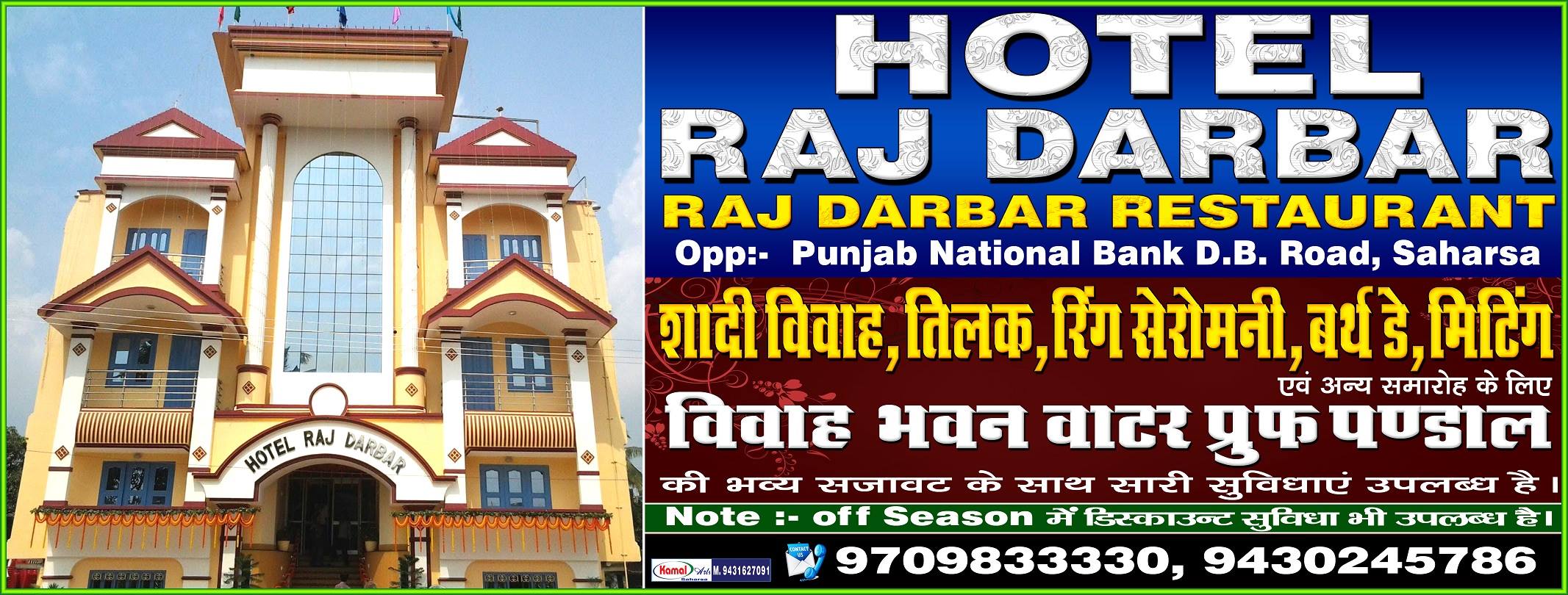 Hotel Raj Darbar, Banquet and Restaurant is an excellent property located at the heart of Saharsa, Bihar, that caters to every kind of customer-from a leisure seeker to a business client-at Hotel Raj Darbar, Banquet, and Restaurant on DB Rd, Naya Bazar, Saharsa, Bihar 852201.